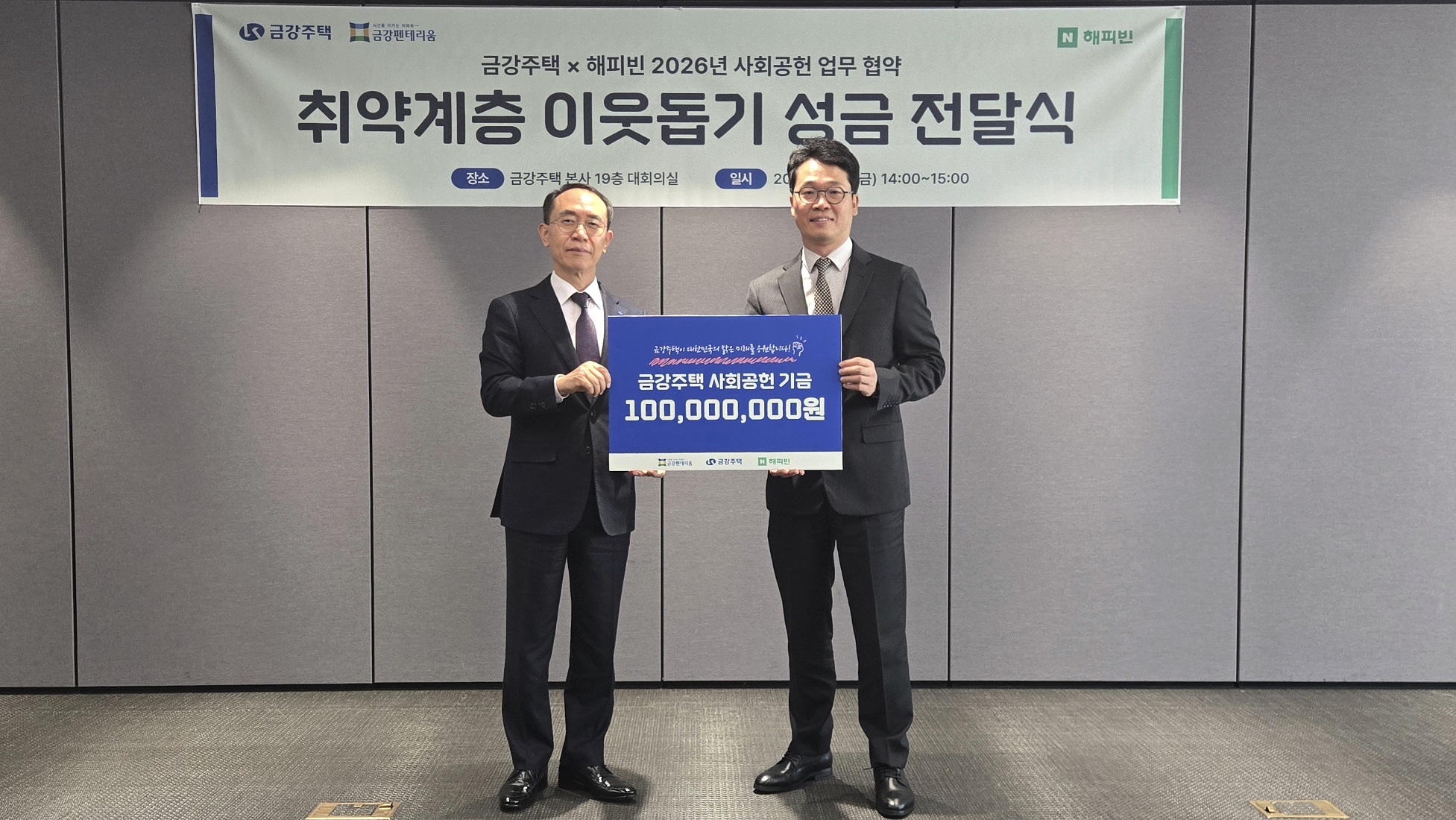 ´ç»ç´Â 12¿ù 19ÀÏ(±Ý) ¿ÀÈÄ 2½Ã, º»»ç ´ëȸÀǽǿ¡¼ ³×À̹ö ÇØÇǺó°ú ‘2026³â »çȸ°øÇå ¾÷¹«Çù¾à(MOU)’À» ü°áÇϰí, Ãë¾à°èÃþ ÀÌ¿ôµ½±â¸¦ À§ÇÑ ±â±Ý 1¾ï ¿øÀ» ±âºÎÇϸç Àü´Þ½ÄÀ» ÁøÇàÇß´Ù. À̳¯ Çù¾à½Ä¿¡´Â ±Ý°ÁÖÅà ÃÖ»ó¼ø »çÀå°ú ³×À̹ö ÇØÇǺó ÀÌÀϱ¸ ´ëÇ¥¸¦ ºñ·ÔÇÑ °ü°èÀÚµéÀÌ Âü¼®ÇØ, ÇâÈÄ »çȸ°øÇå Çù·Â ¹æÇâ°ú Áö¿ø »ç¾÷¿¡ ´ëÇØ ³íÀÇÇß´Ù.
