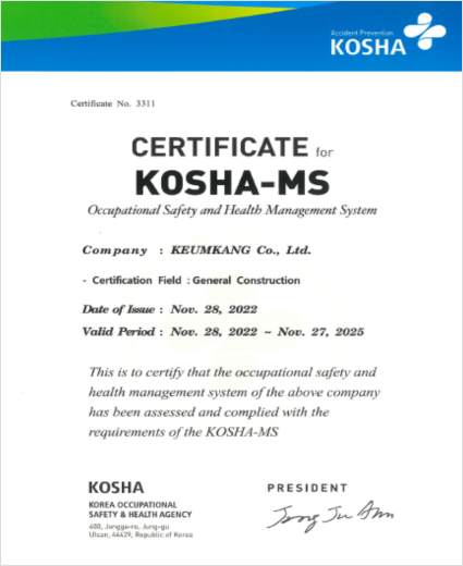 (주)금강주택은 2022년 11월 국내 안전보건경영시스템 규격인 KOSHA-MS를 획득하여